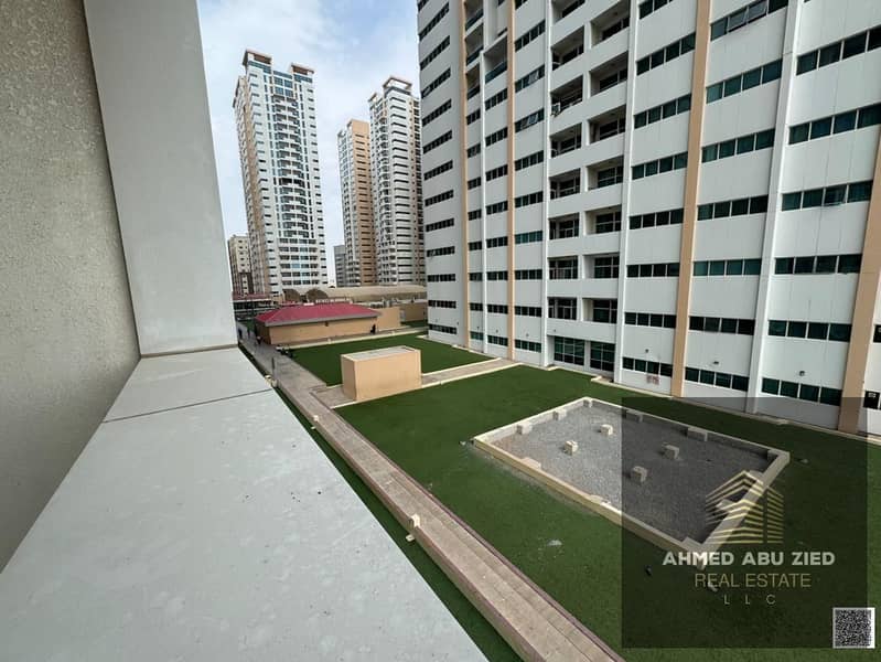 1-bedroom apartment for annual rent in Al Rashidiya Ajman, 2 bathrooms, balcony with open view, central AC, spacious hall, master room, gym, pool, kid