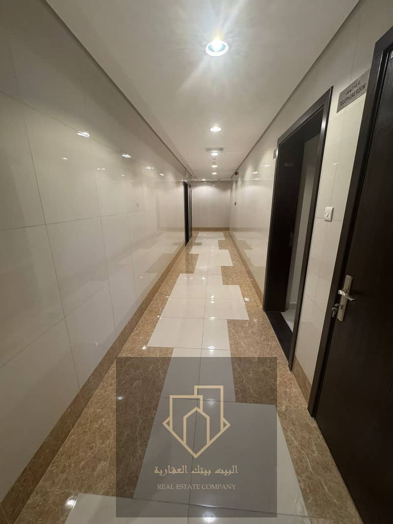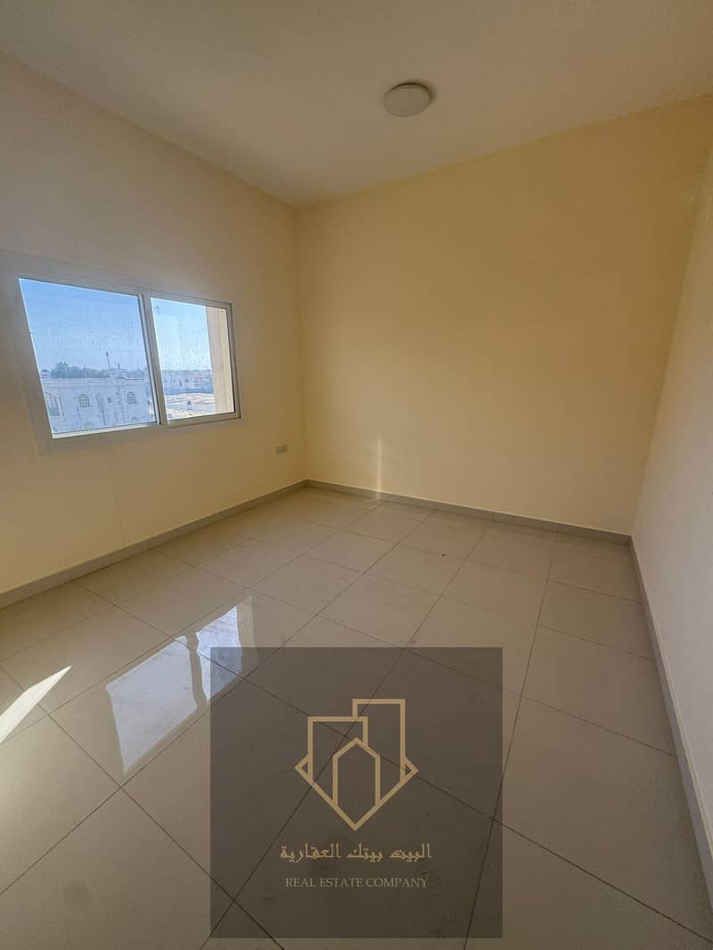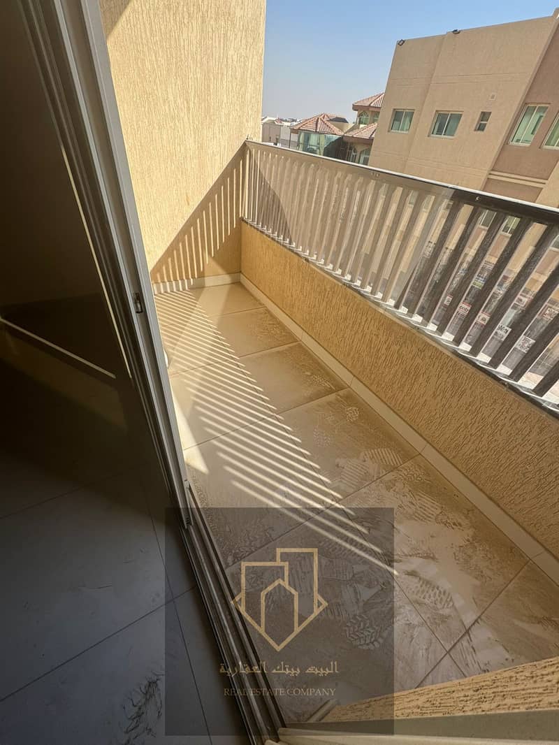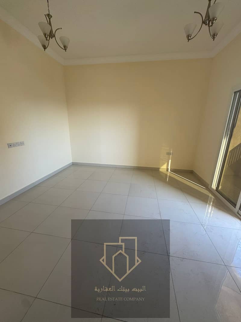 Brand-new first-occupant apartment in Al Rawda 1: 1 bedroom, living room with closed lounge, 2 bathrooms, balcony, spacious, 4-installment payment, security cheque.