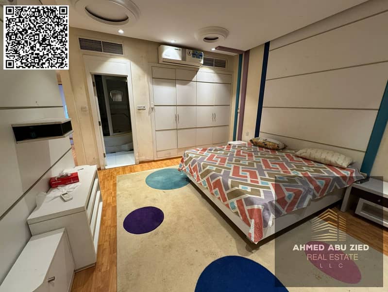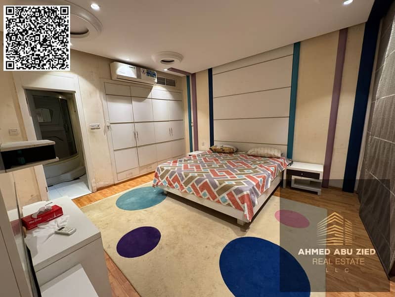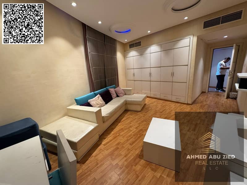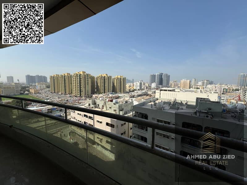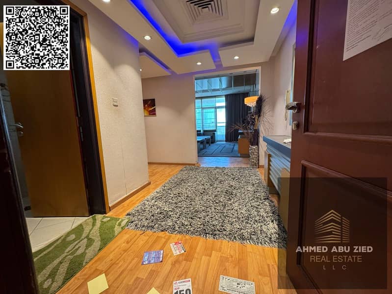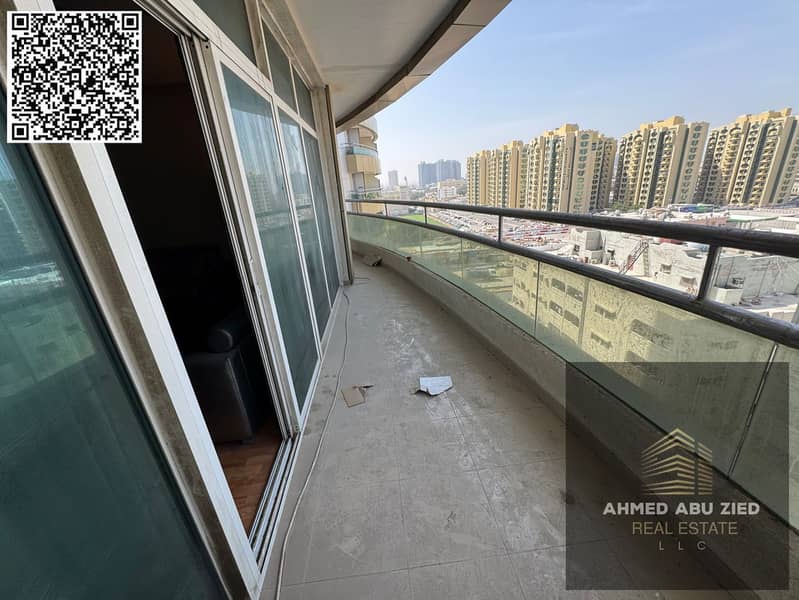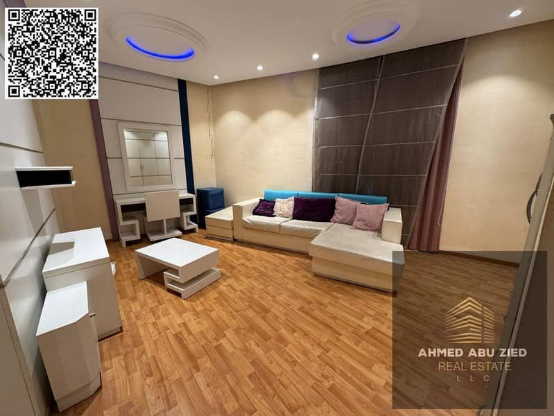 For annual rent in Ajman, a furnished one-bedroom apartment with a living room, two bathrooms, a balcony with an open view, a very spacious layout