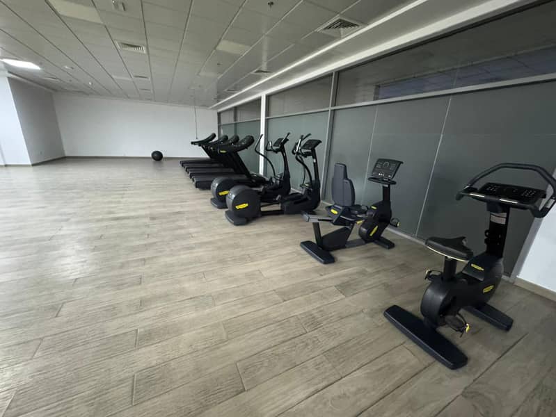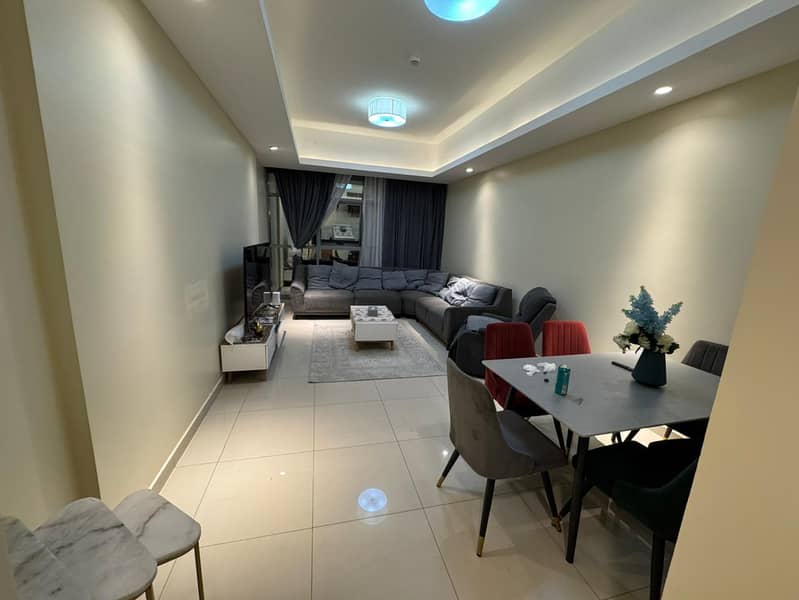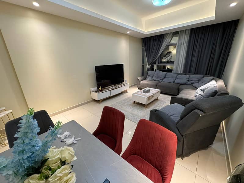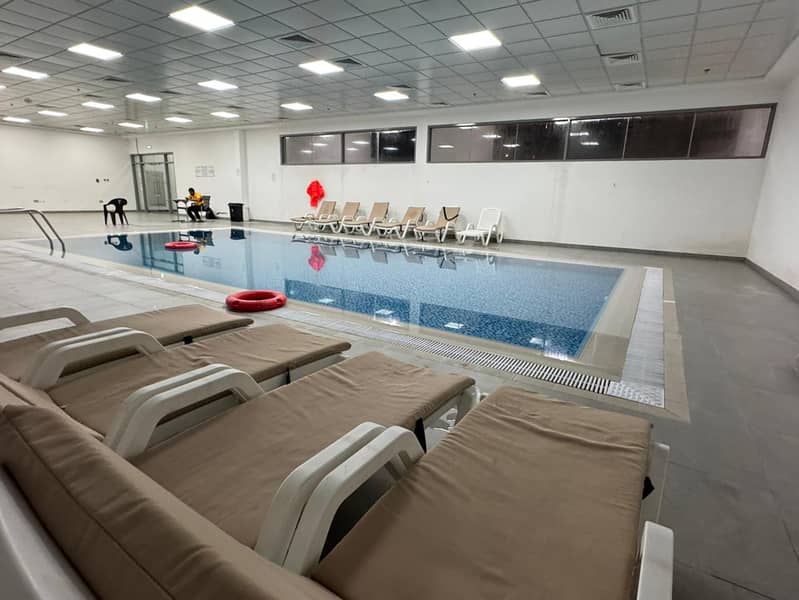 Furnished 1BR hall for annual rent in Gulfa Towers (Rashidiya 1). Gym & pool, super deluxe finish, spacious, built-in wardrobes, balcony, central AC.