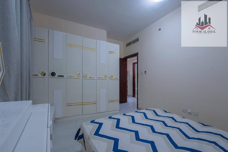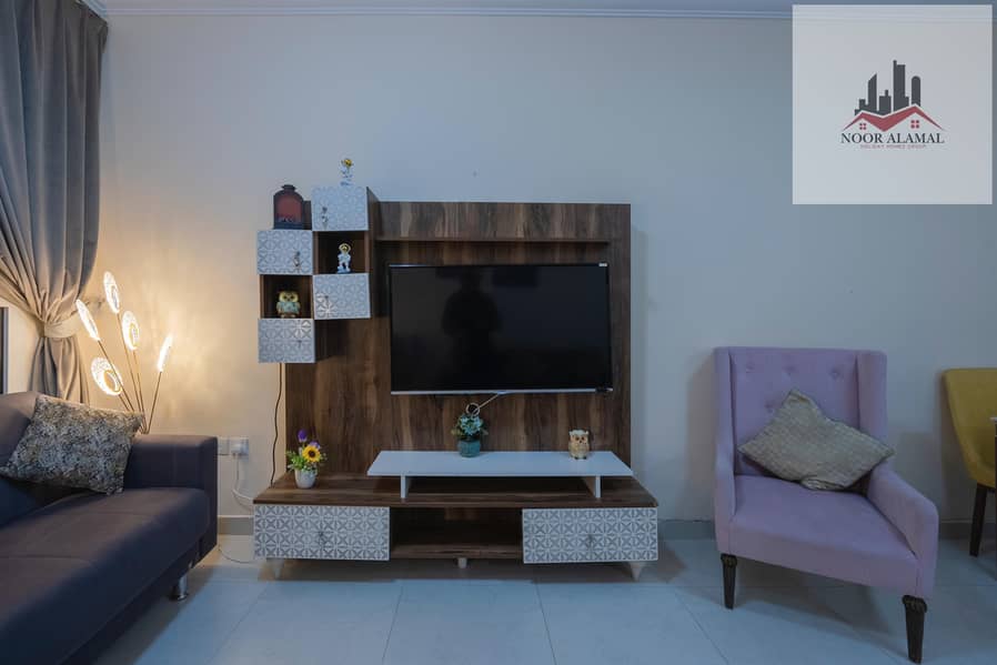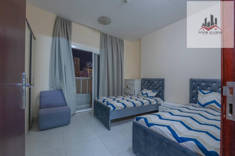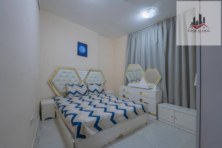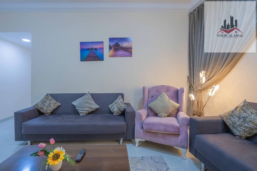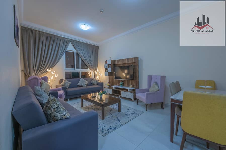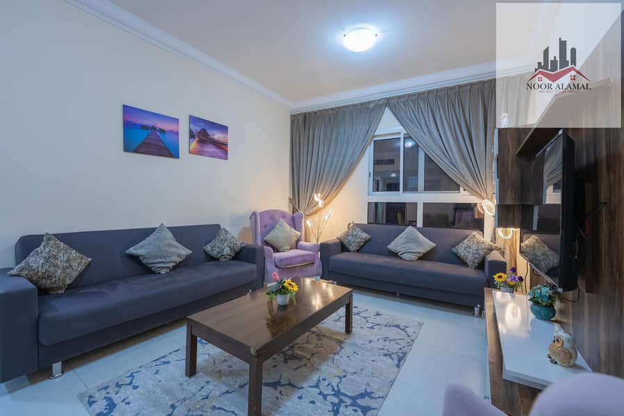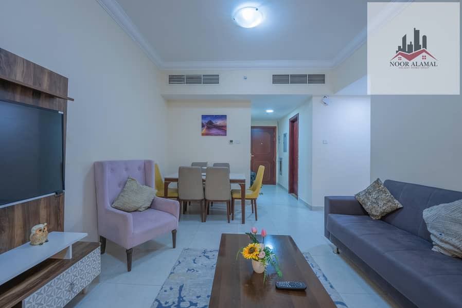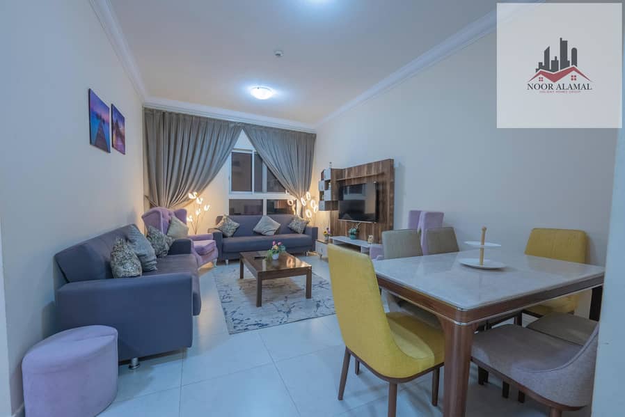Sharjah, Al Taawun, next to Oriana Hotel. Two bedrooms, living room, kitchen, two bathrooms, and a balcony with a sea view.