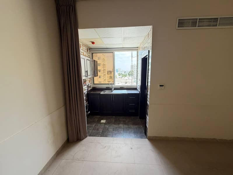 Studio apartment for annual rent in Al Rashidiya, Ajman, opposite the Ladies' Park. New building, full maintenance included by the owner, central air