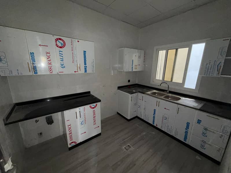1bhk For annual rent in Al Muwaihat, Ajman, first occupancy. The apartment consists of a master bedroom, living room, 2 bathrooms, and a balcony.