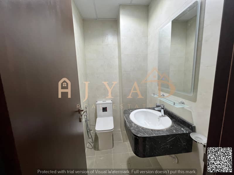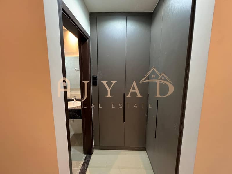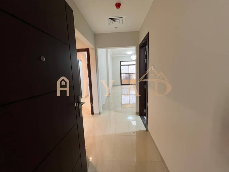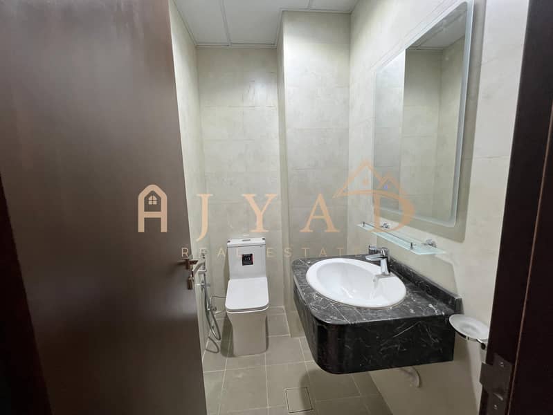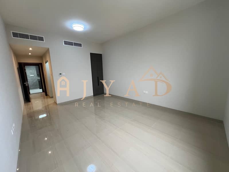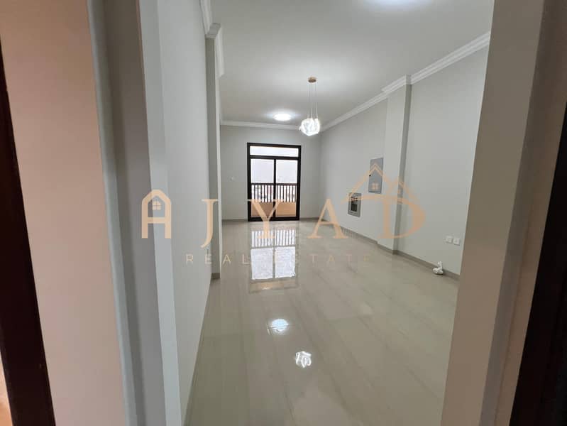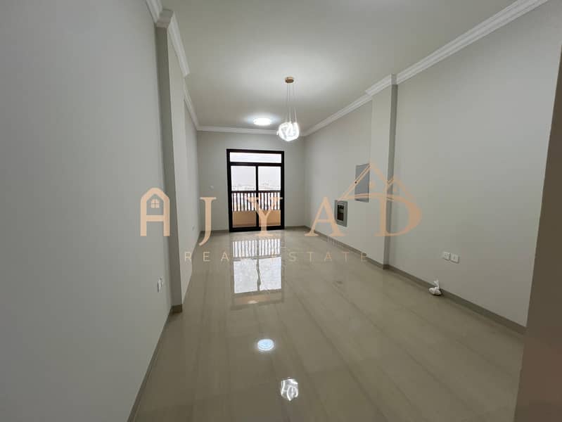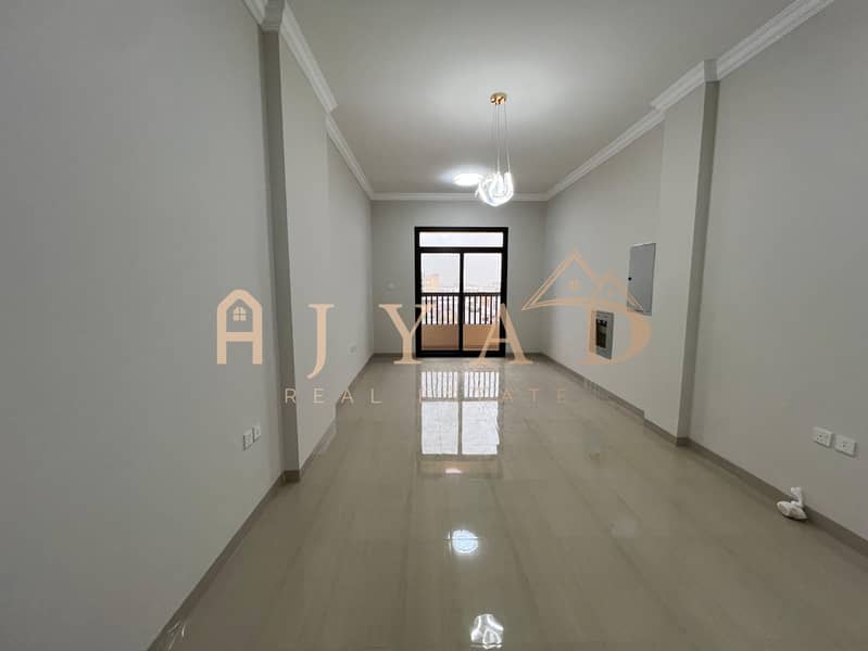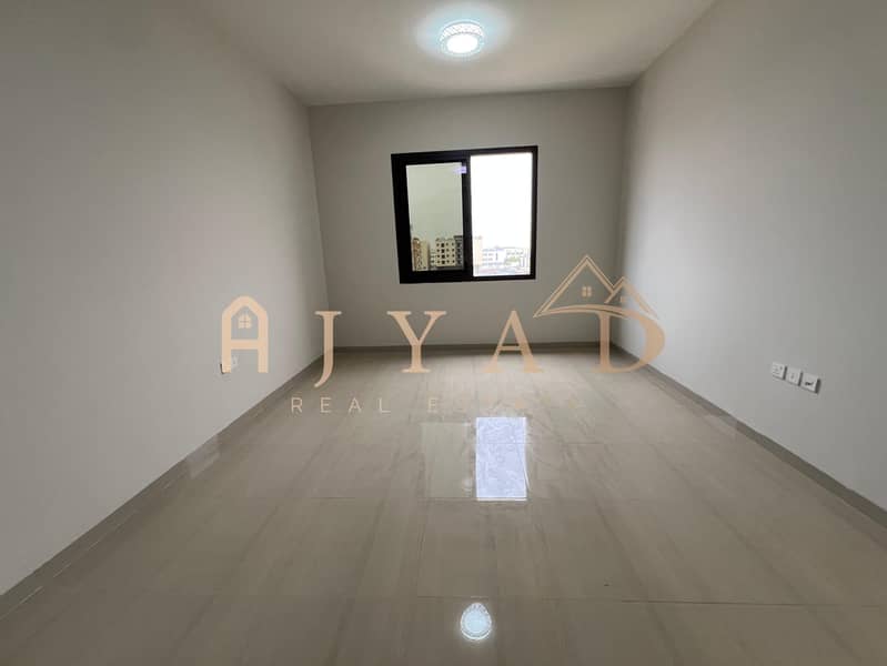 For annual rent, first occupancy, brand new building, one-bedroom apartment in Al Muwaihat 3, near Al Sha'la School. Central air conditioning.
