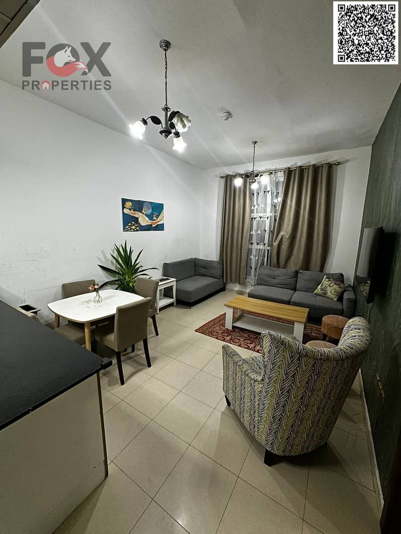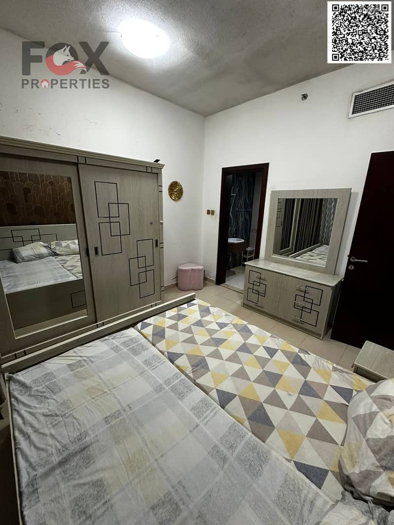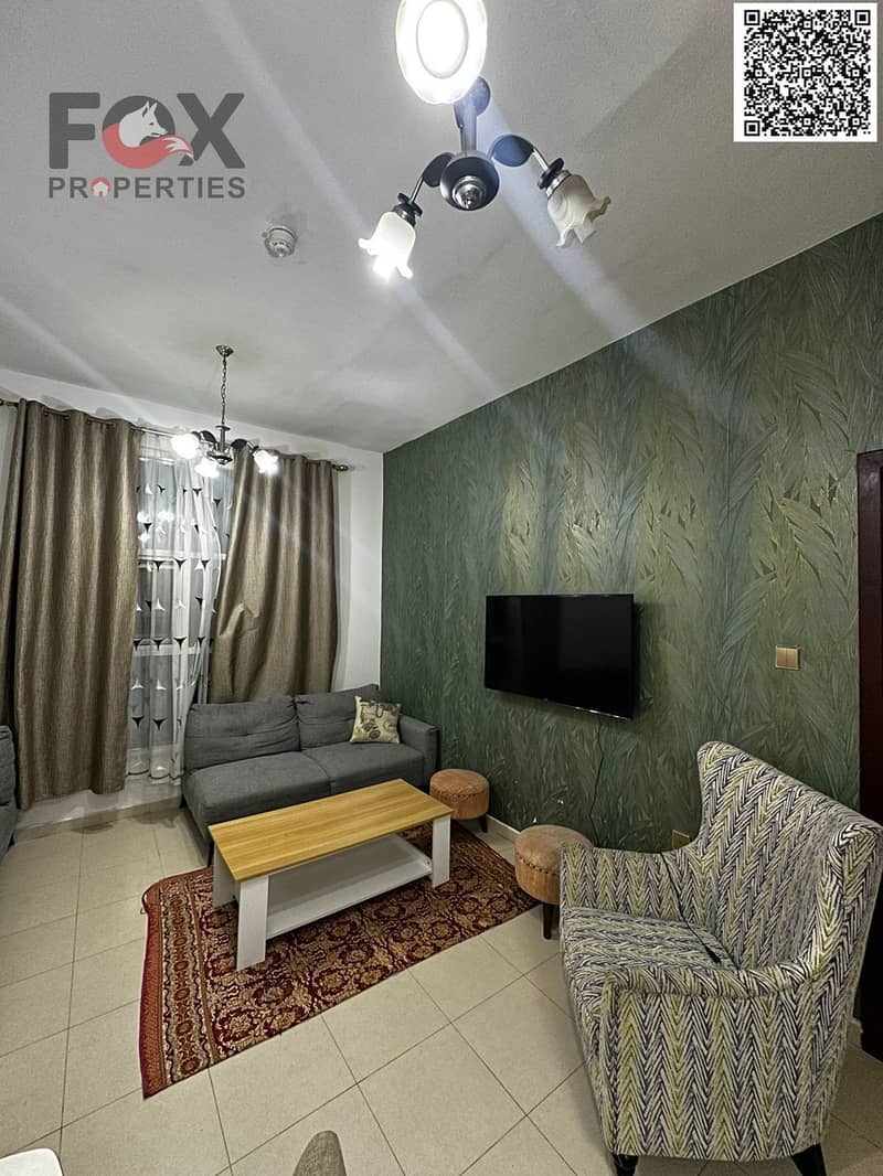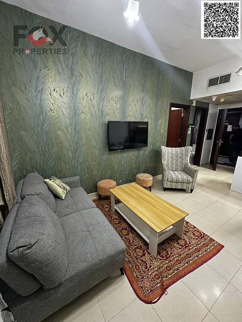 For annual rent in Ajman, a furnished one-bedroom apartment with a living room, balcony, and two bathrooms in City Towers. Prime location close to all