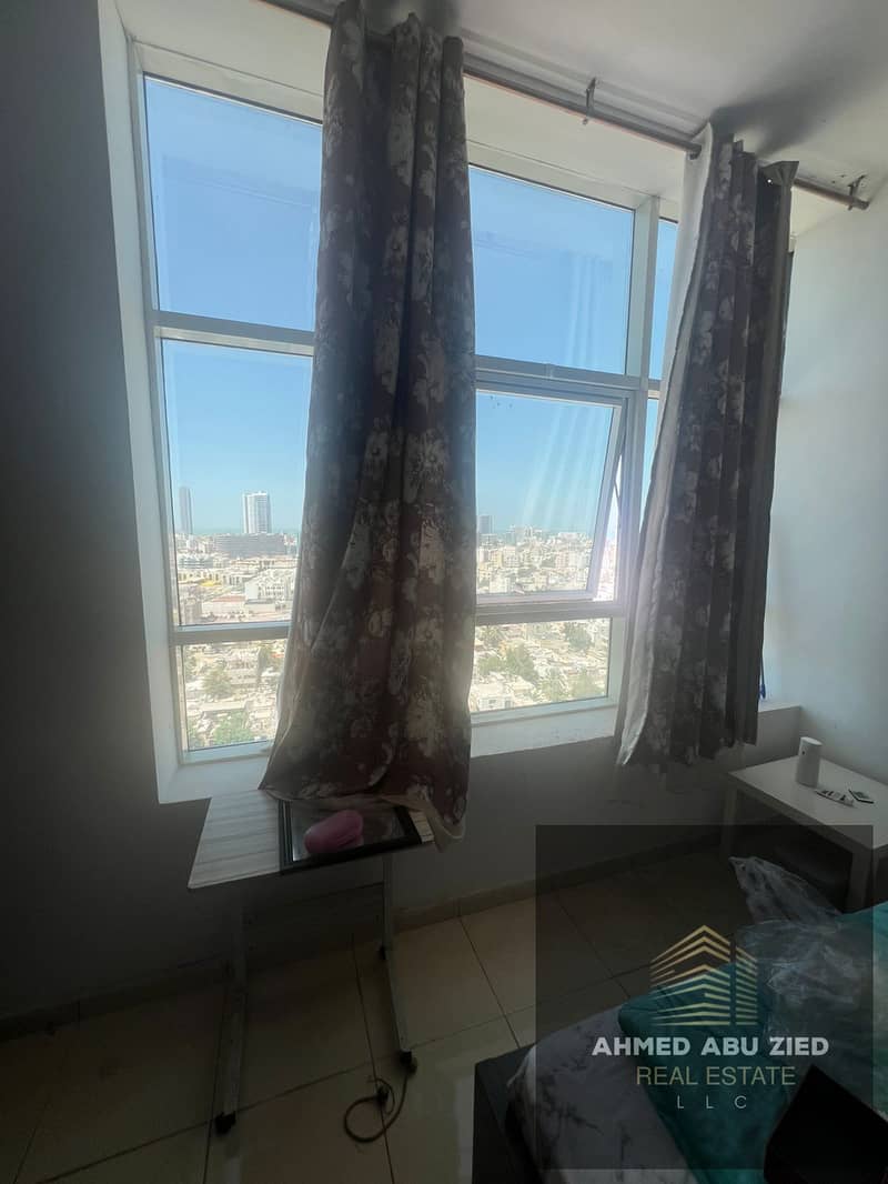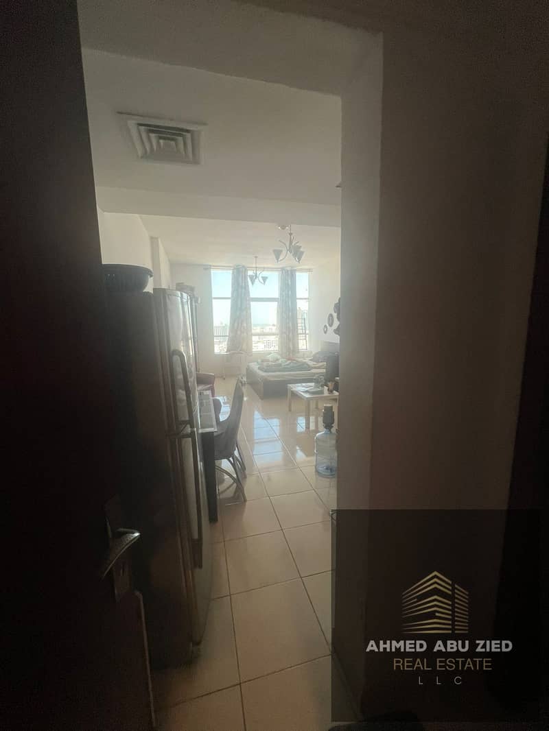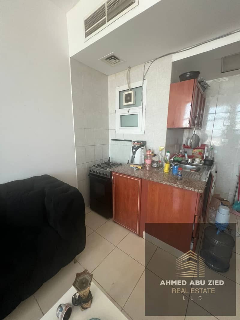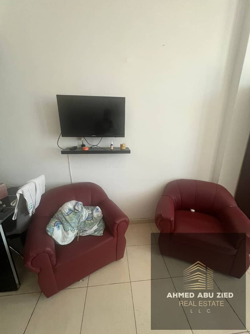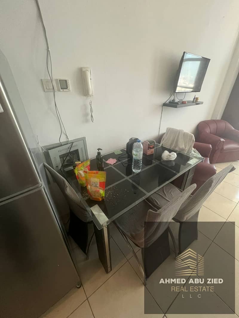 Fully furnished studio for annual rent in Orient Towers, prime location close to all services. Rent AED 24,000, payable in 4 installments, security de