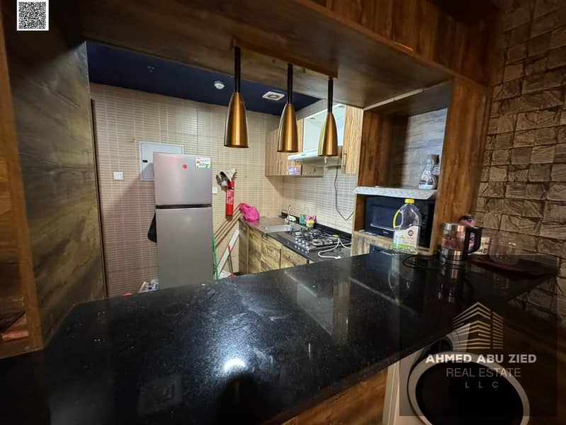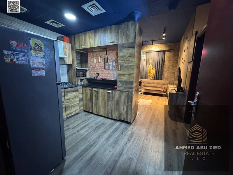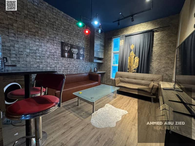 Furnished 1BR hall in Al Nuaimiya Ajman, equipped kitchen, central AC, balcony, continuous maintenance, quiet & clean, 24h security, near services.