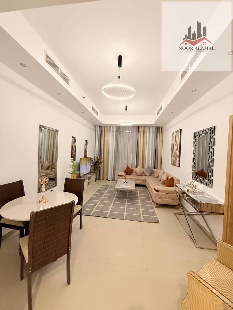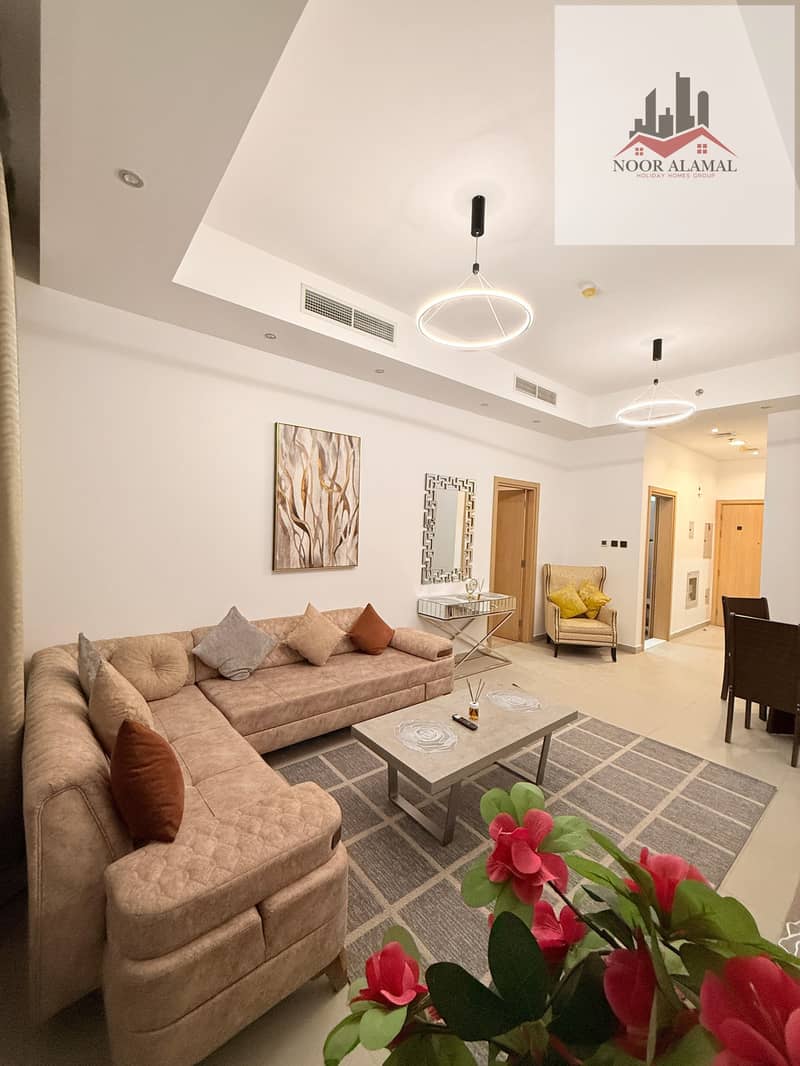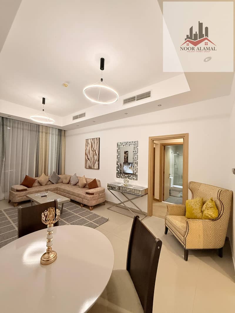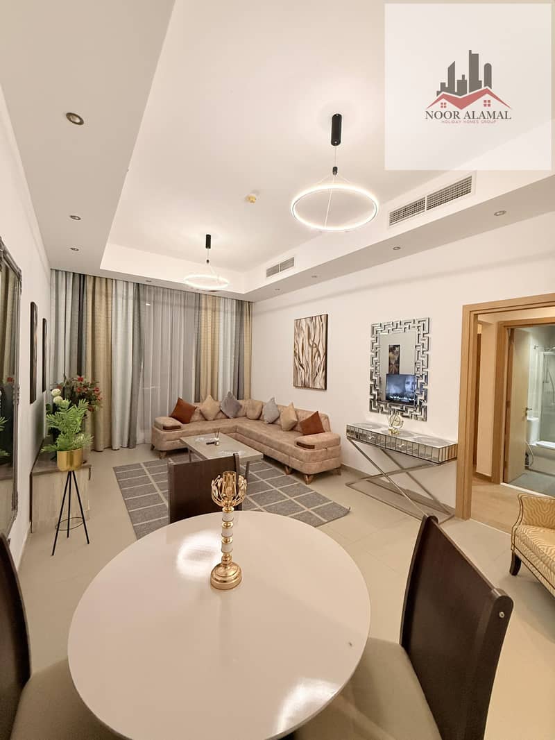 Sharjah, Al Mamzar, Al Abraj Tower, one-bedroom apartment with living room, kitchen, and two bathrooms.