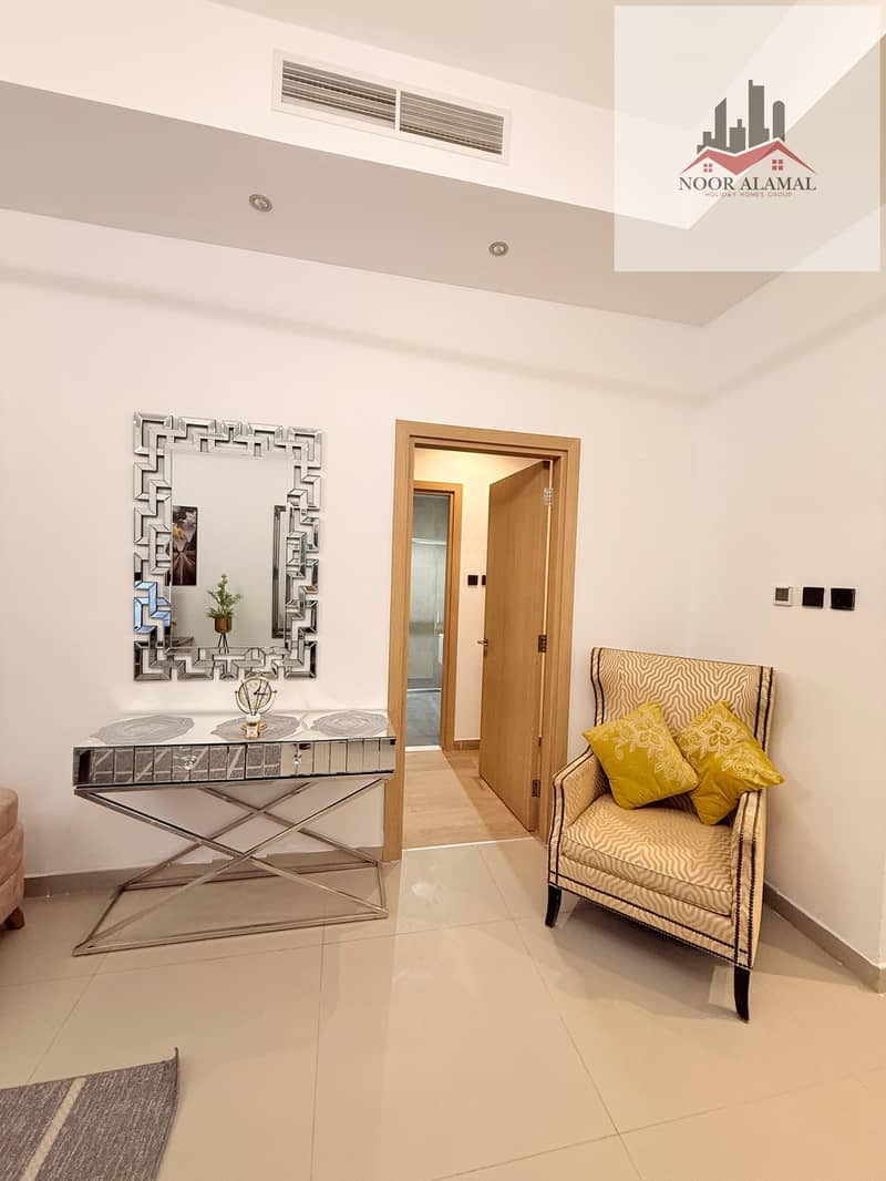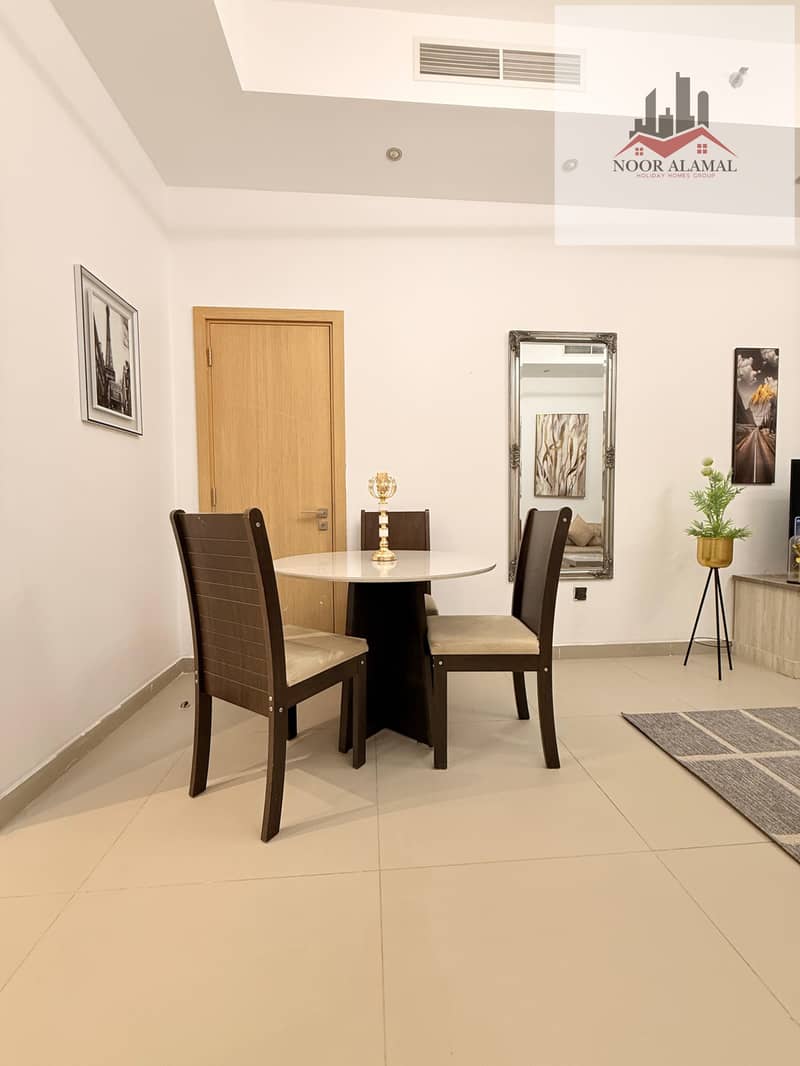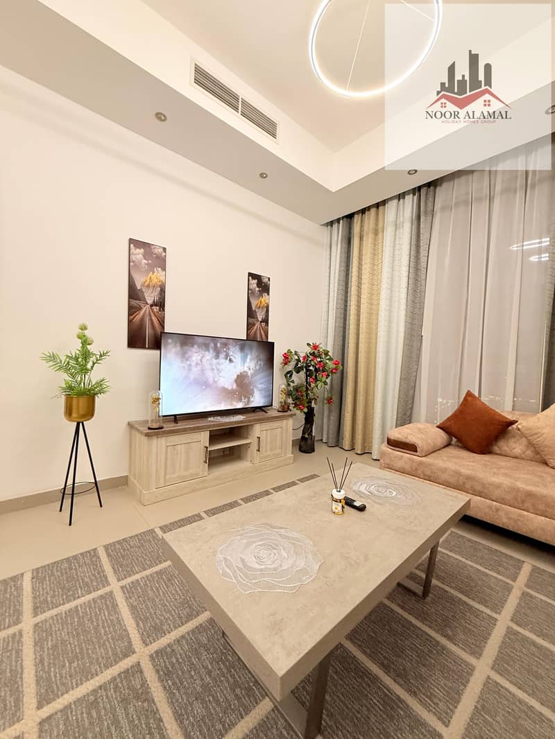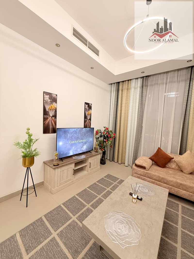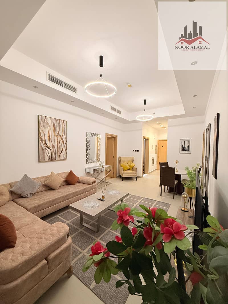 Sharjah, Al Mamzar, Al Abraj Tower, one-bedroom apartment with living room, kitchen, and two bathrooms.