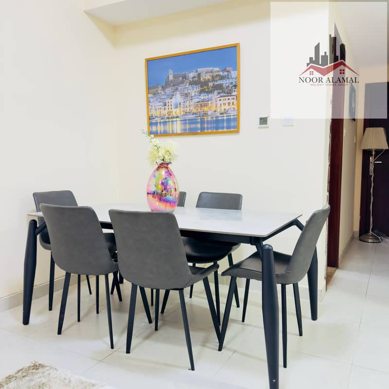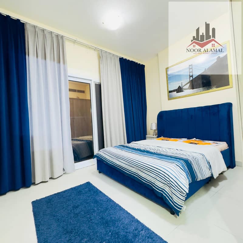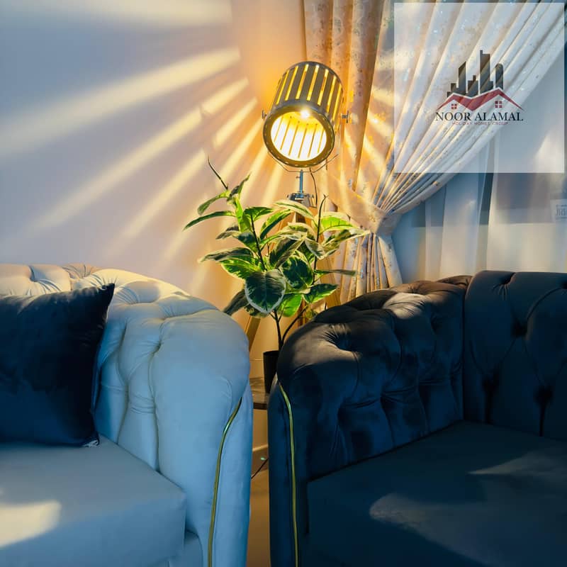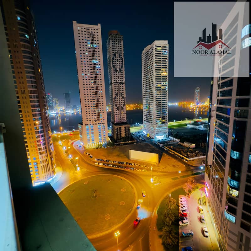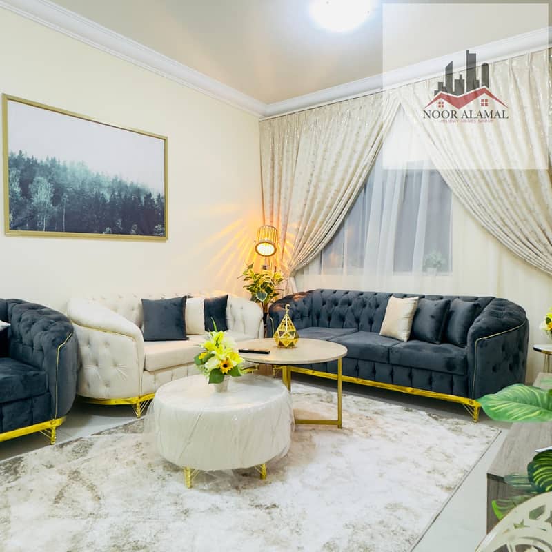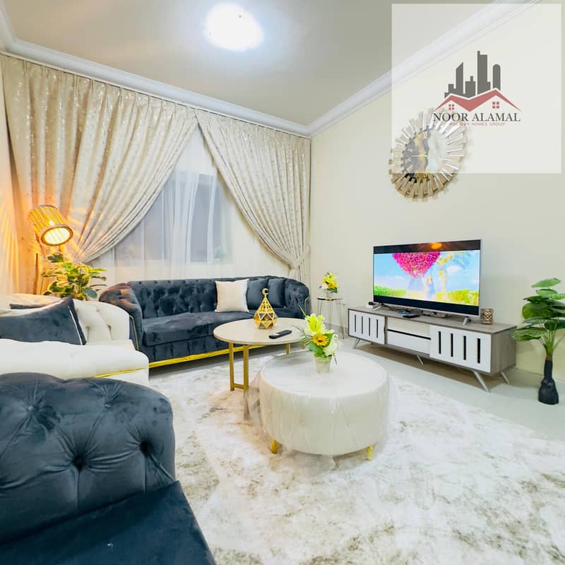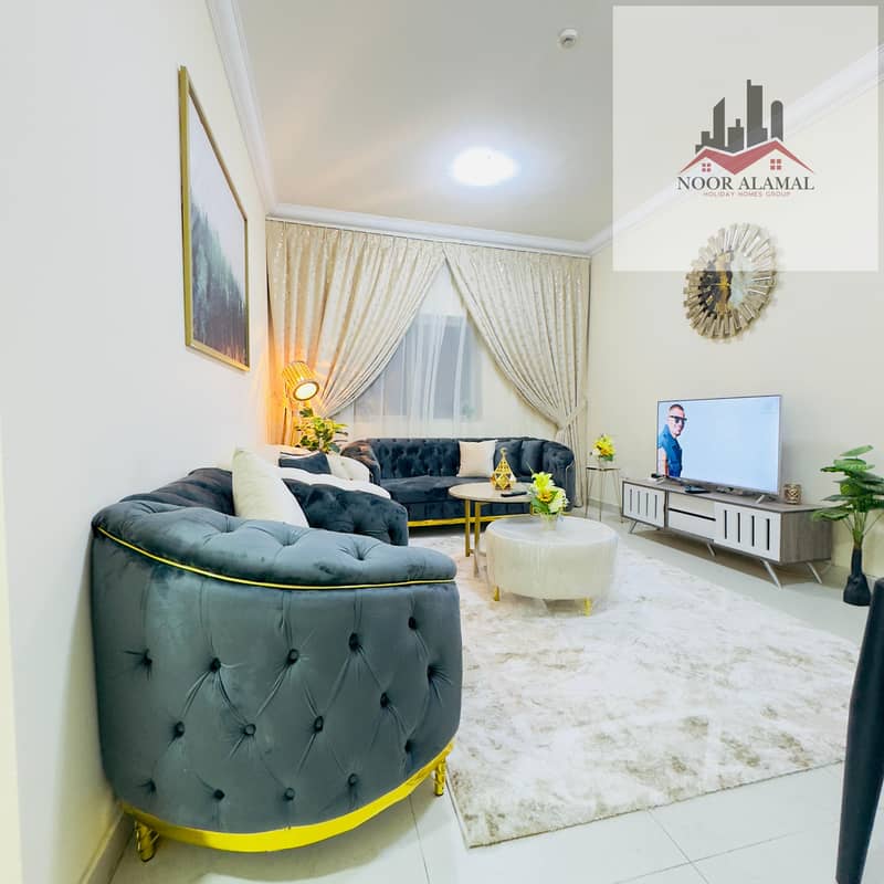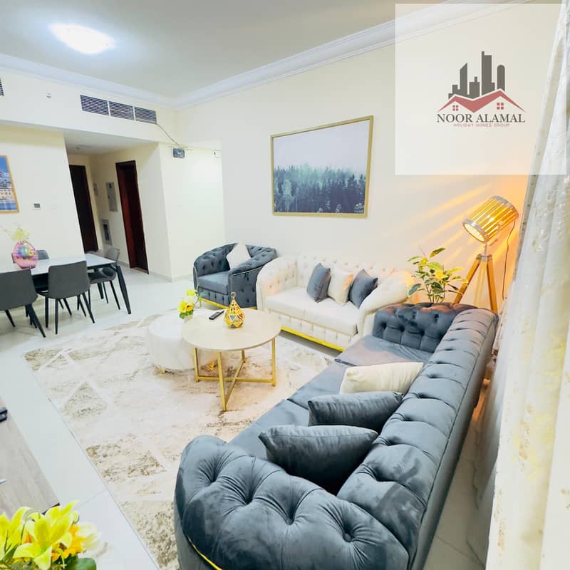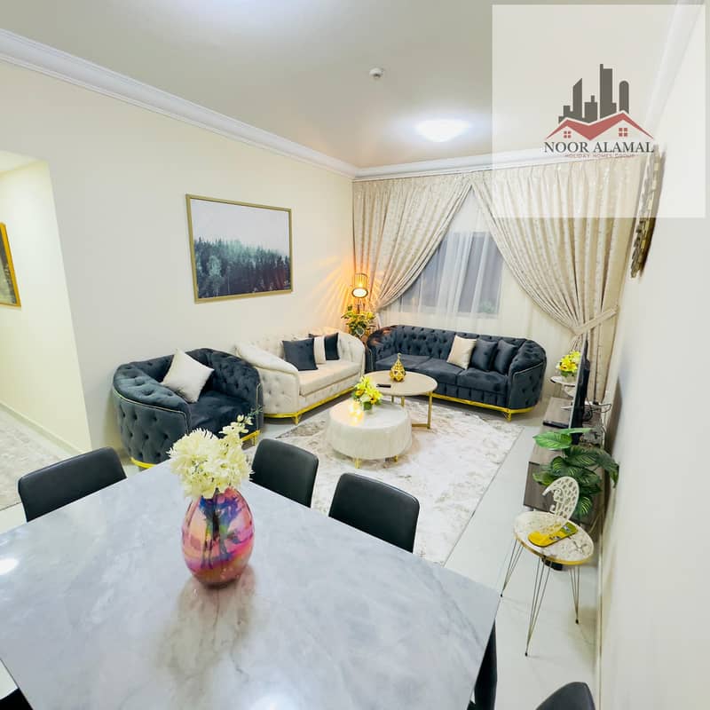 Sharjah, Al Taawun area: Two bedrooms, living room, kitchen, and two bathrooms, next to Oriana Hotel. Super deluxe furnishings