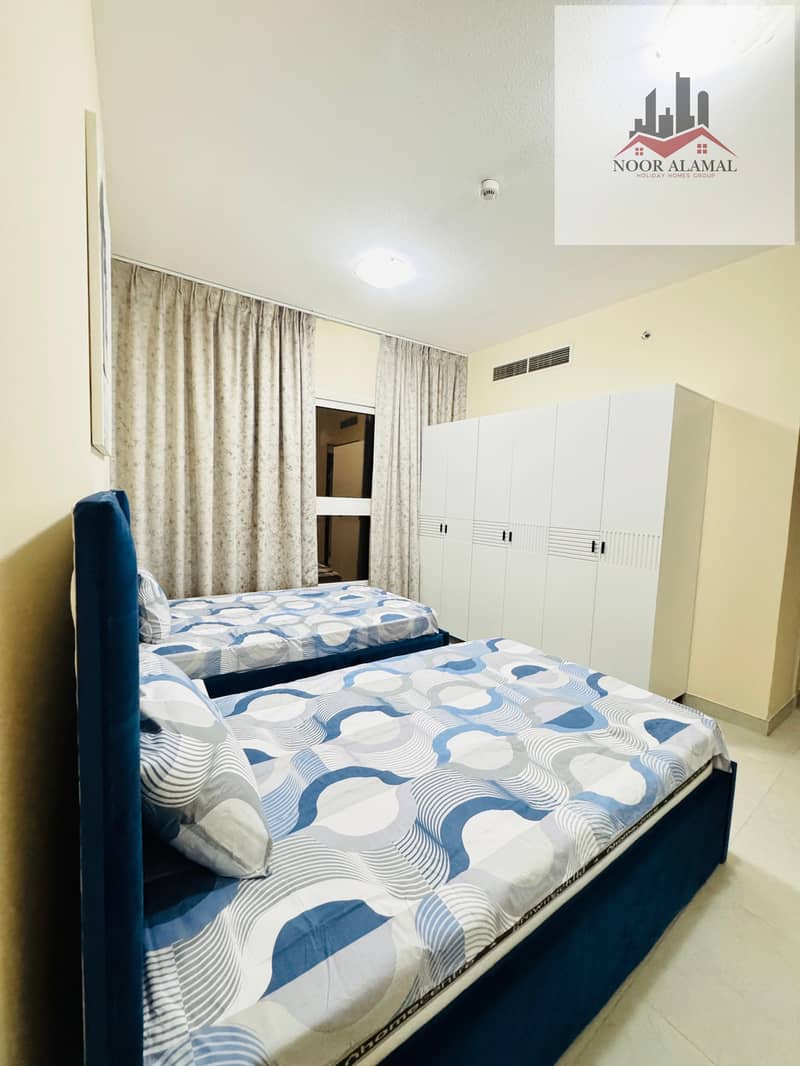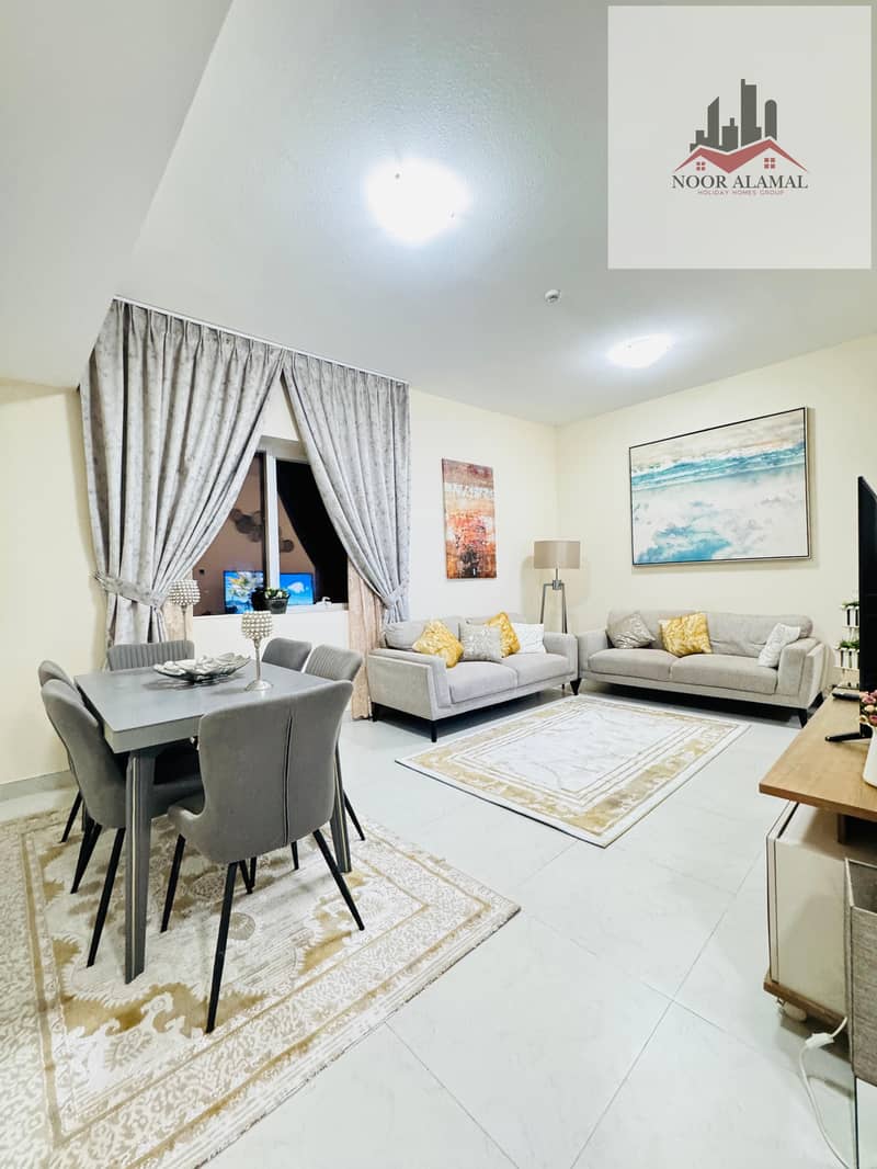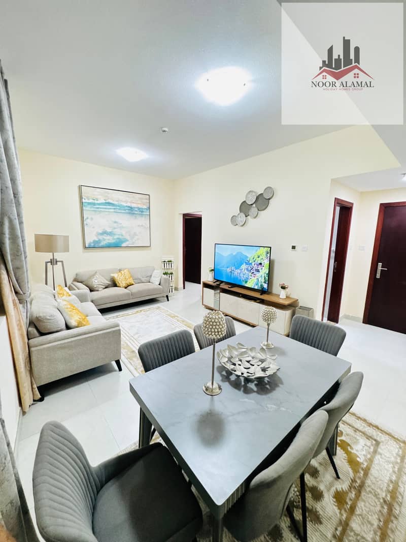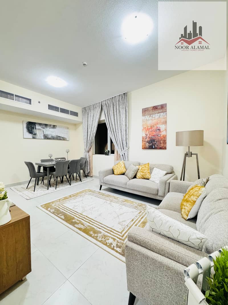 Sharjah, Al Taawun area: Two bedrooms, living room, kitchen, two bathrooms, and balcony. Price: 4700 AED including internet.