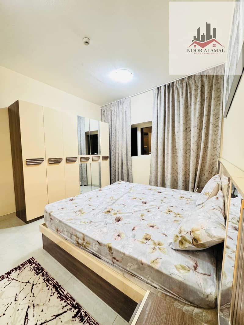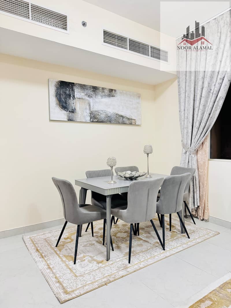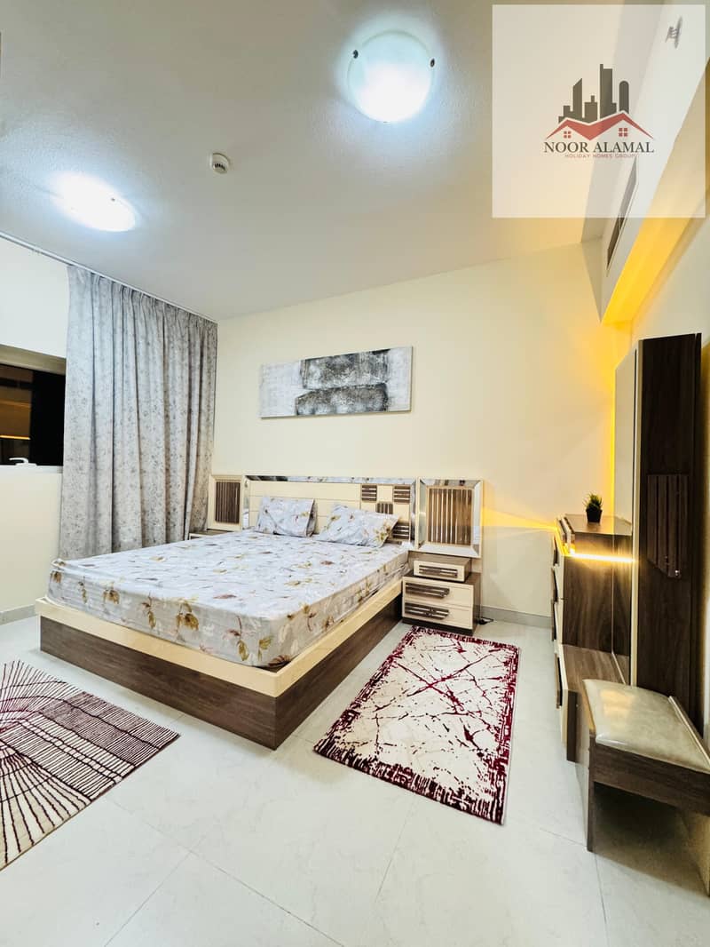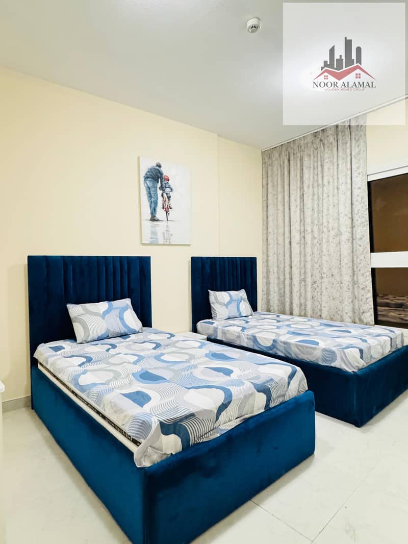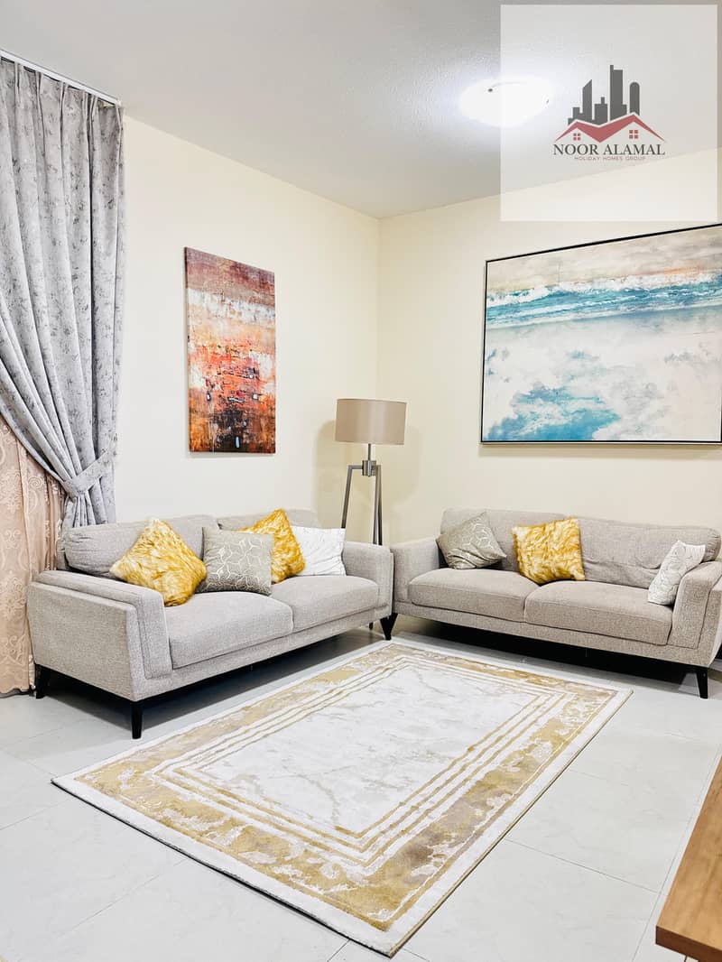 Sharjah, Al Taawun area: Two bedrooms, living room, kitchen, two bathrooms, and balcony. Price: 4700 AED including internet.