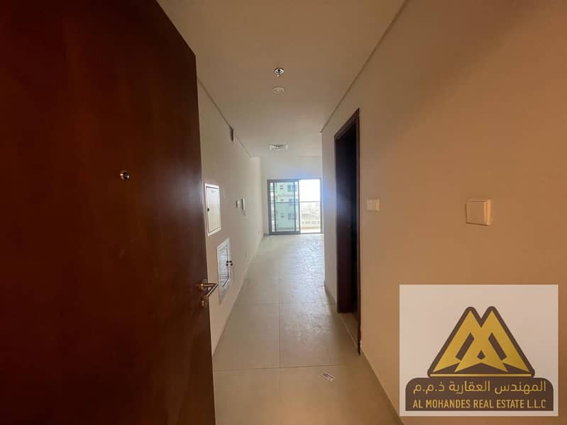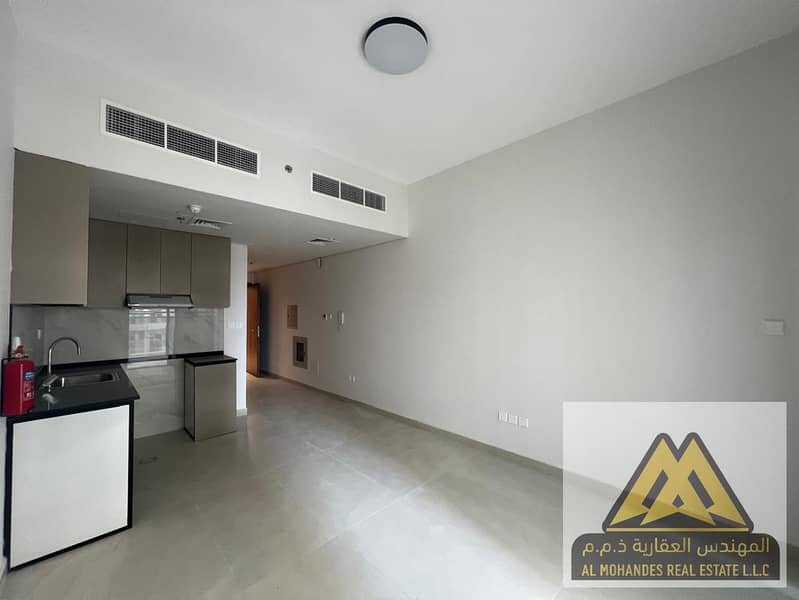 Studio apartment for annual rent in Al Aamra Residence Towers, Ajman. Spacious area with balcony, kitchen, and open view.
