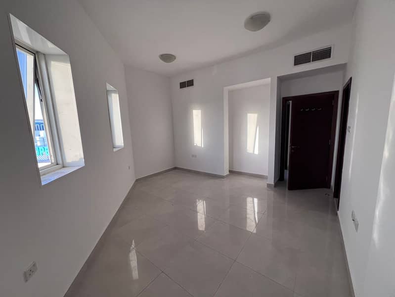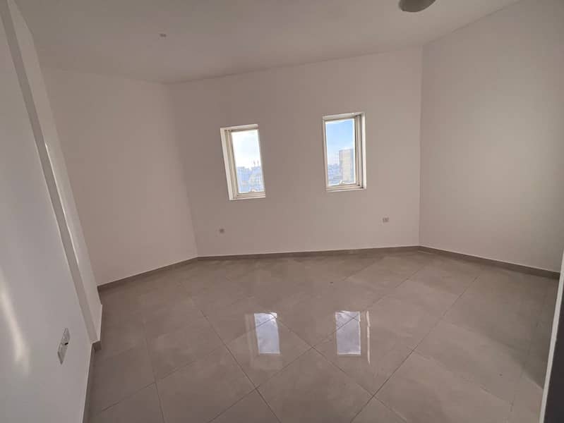 Two-bedroom master apartment for rent in Al Rawda, Ajman, on Sheikh Ammar Street. Features a balcony with an open view and panoramic window. Spacious